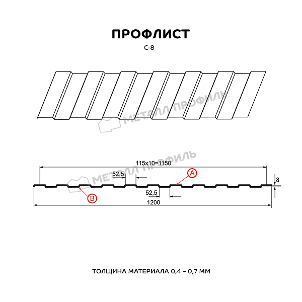 Профнастил с самой низкой волной. Его назначение – в большей степени дизайнерская задача, чем несущая. С-8 прекрасно решает такие задачи, как: системы подвесных потолков, монтаж вентилируемых фасадов, внутренняя облицовка индустриальных помещений, возведение ограждений, не подверженных большим климатическим нагрузкам. Одинаковая с обеих сторон конфигурация проката делает С-8 универсальным сырьём для различных архитектурных замыслов. Достаточная толщина стали – от 0,4 до 0,7 мм позволяет профнастилу прекрасно справляться с любым своим назначением. А большая полезная ширина (1150 мм) помогает сэкономить на закупке профлистов. По вашему заказу мы можем изготовить листы металлопроката длиной от 0,5 до 12 метров.