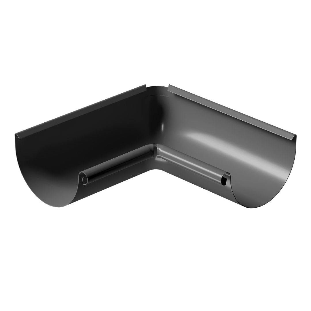 Два соседствующих желоба на внутреннем угле дома можно соединить под прямым углом с помощью изделия — внутренний угол желоба 90˚. Данный элемент может быть окрашен в тон остальным частям водостока «Stal Standard» в один из двух цветов, среди которых универсальный оттенок серого.